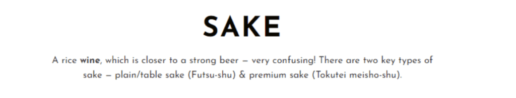“A rice wine, which is actually closer to a strong beer — very confusing!” https://www.irishdrinkshop.com/Sake accessed 30 July 2023