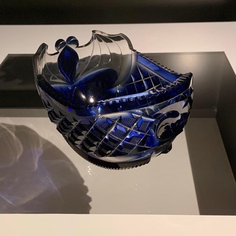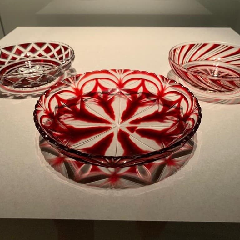 The first book describing glass making in Japan was published in 1829. In 1834, artisans developed a beautiful cut glass technique in Tokyo (known as Edo kiriko; Edo was the name of Tokyo before the Meiji Restoration), followed by Kagoshima in 1851 (known as Satsuma kiriko; Satsuma is the pre-Meiji name of the Southern Kyushu region, the name of the ruling clan). Satsumo kiriko is well known for its magnificent transparent red material (color produced by copper), and diverse motif compositions. European cut glass (Bohemia, England …) influenced the design, however, as often is in the world of arts, local craftspeople went one step further and developed a unique style. The Satsuma glass making workshops were burnt to ashes during the Anglo Satsuma war of 1863. Glass making was restarted in 1872, with beautiful objects sent to the Imperial Household, however specialists judge that Satsuma kiriko never fully recovered from this 10-year long interruption. The exhibition presented this boat shaped bowl with a bat on the stern (a symbol of good fortune), its wings outspread, and a tomoe motif (yin-yang double interlocking comma) on the prow. It probably had different usages, including this of a haisen, a bowl filled with clean water, placed between people drinking together, so that one could rinse (i.e. clean) the sake cup before passing it to the other.